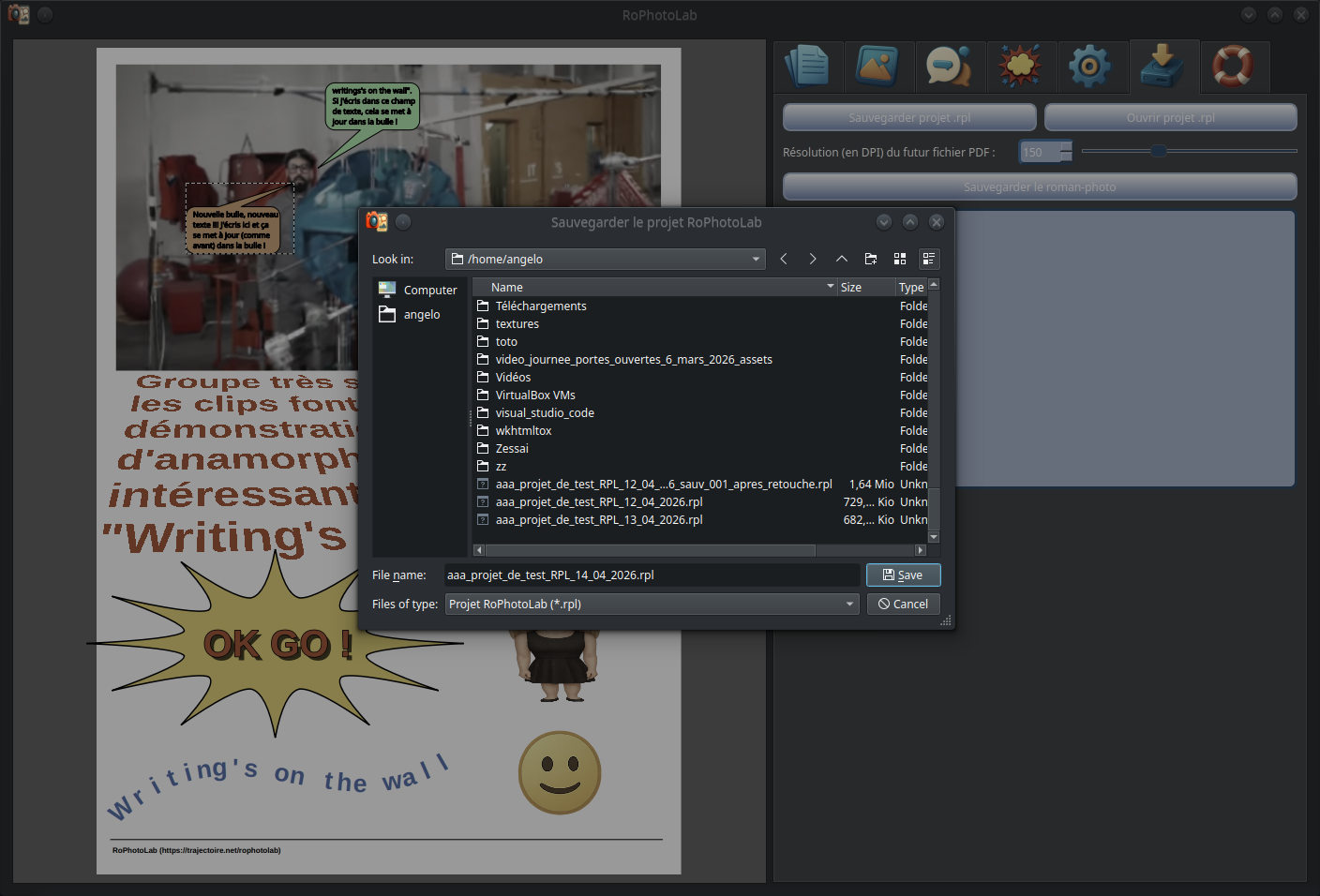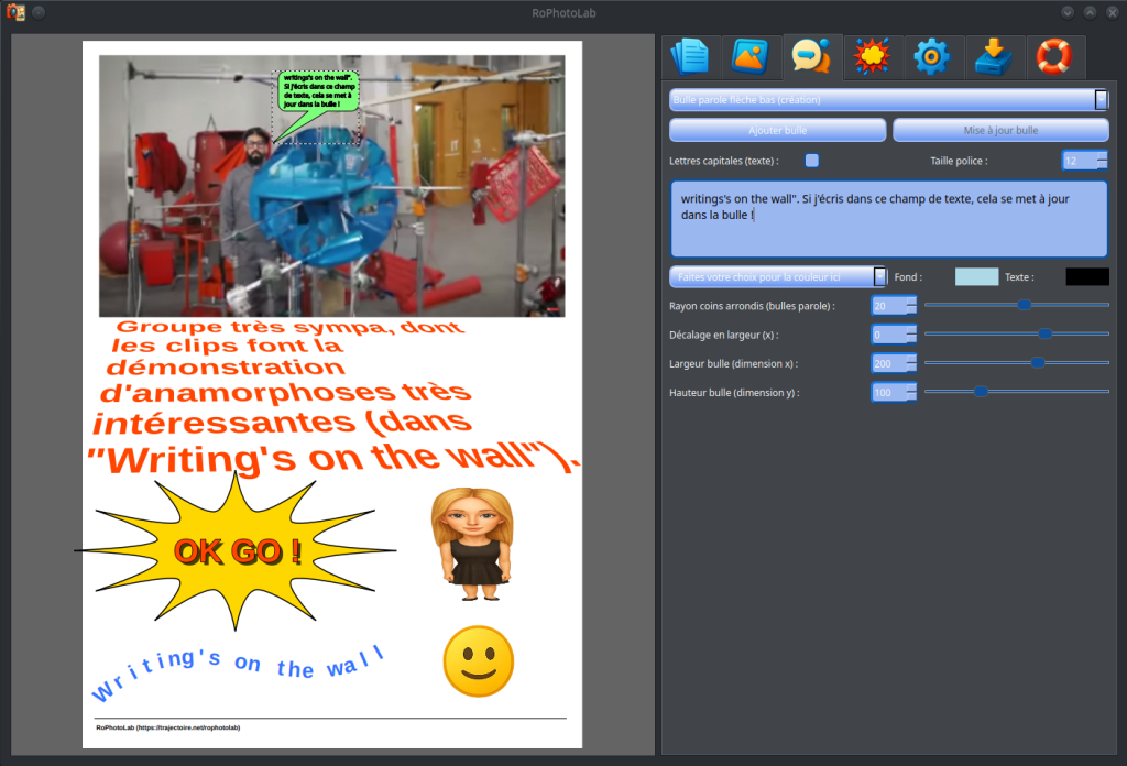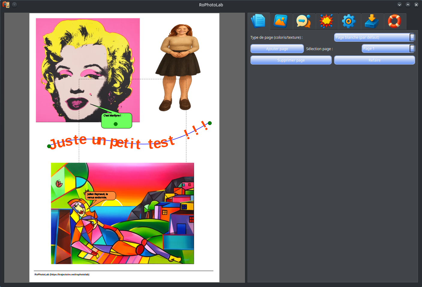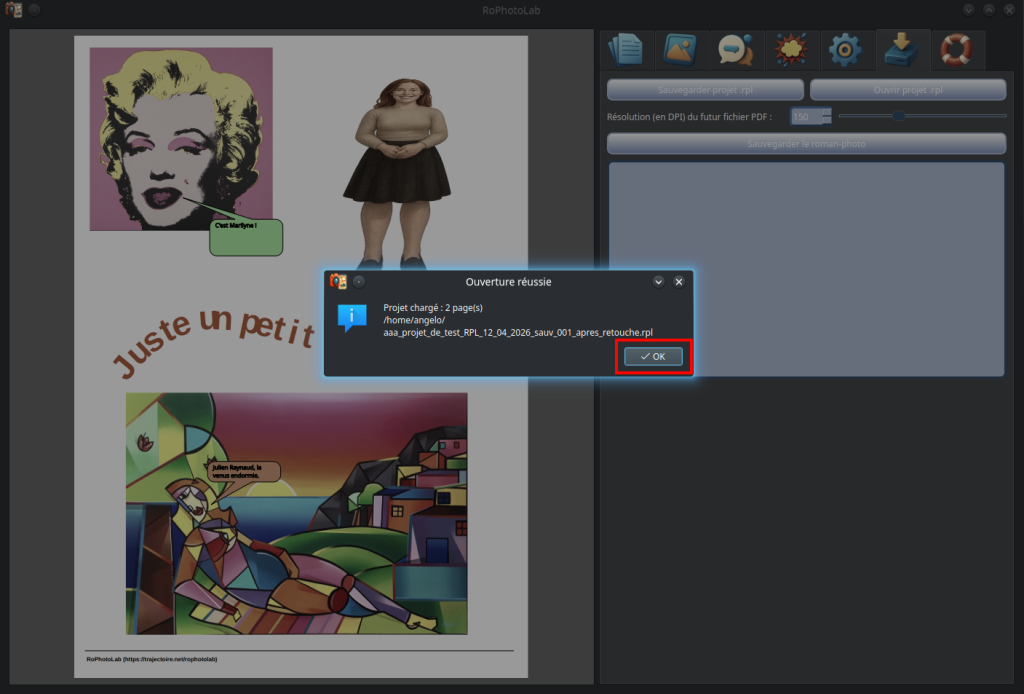 C'est une avancée considérable par rapport aux versions précédentes. RoPhotoLab est maintenant capable d'enregistrer et de redéployer l'intégralité d'un projet — images comprises — de même pour le contenu textuel des bulles et la position de leurs pointes, tout en permettant une édition fluide et intuitive après rechargement. Le cycle complet — créer, sauvegarder, rouvrir, retoucher, re-sauvegarder — fonctionne désormais sans perte d'information.