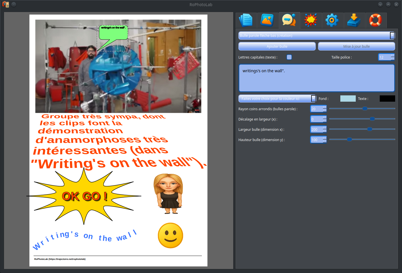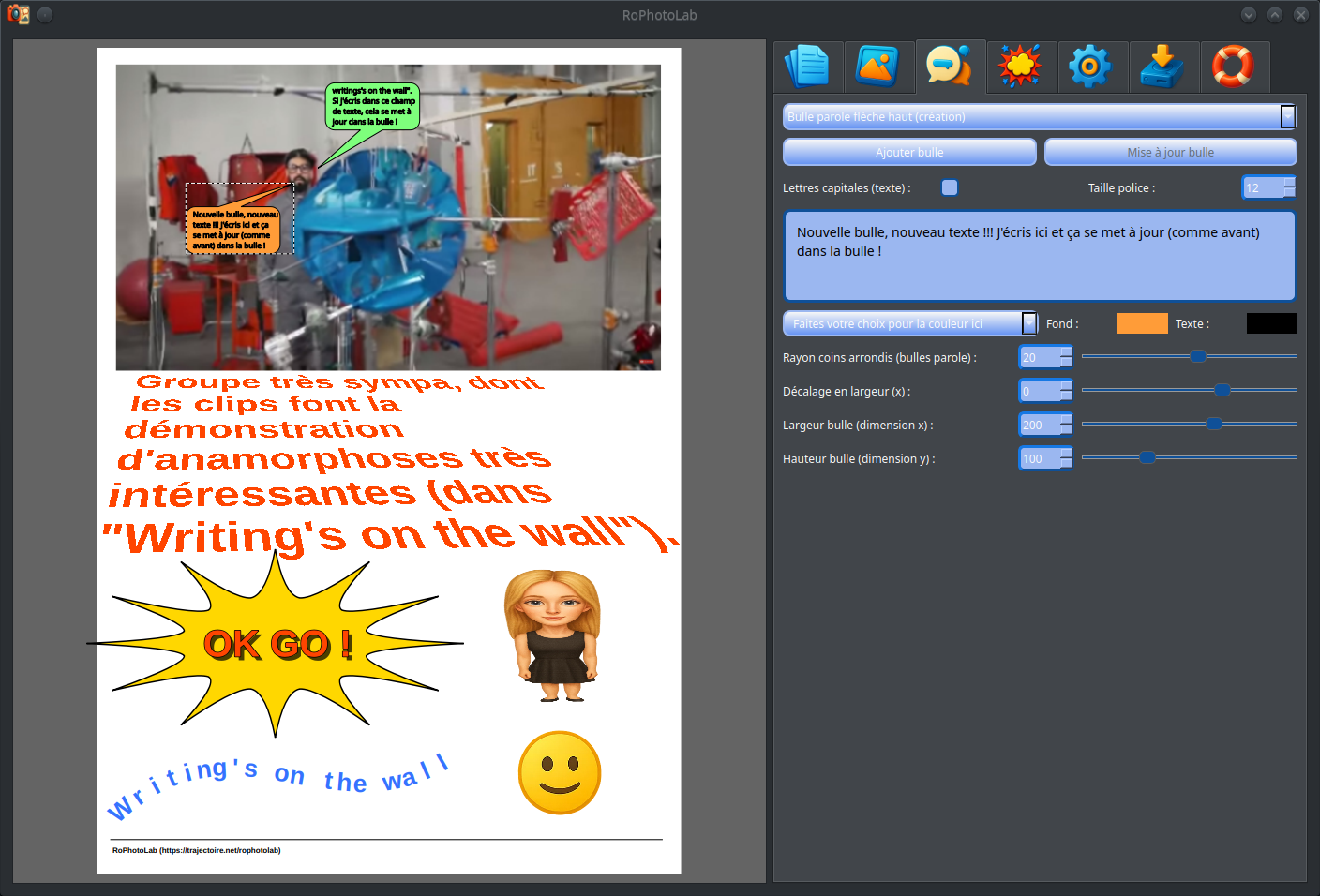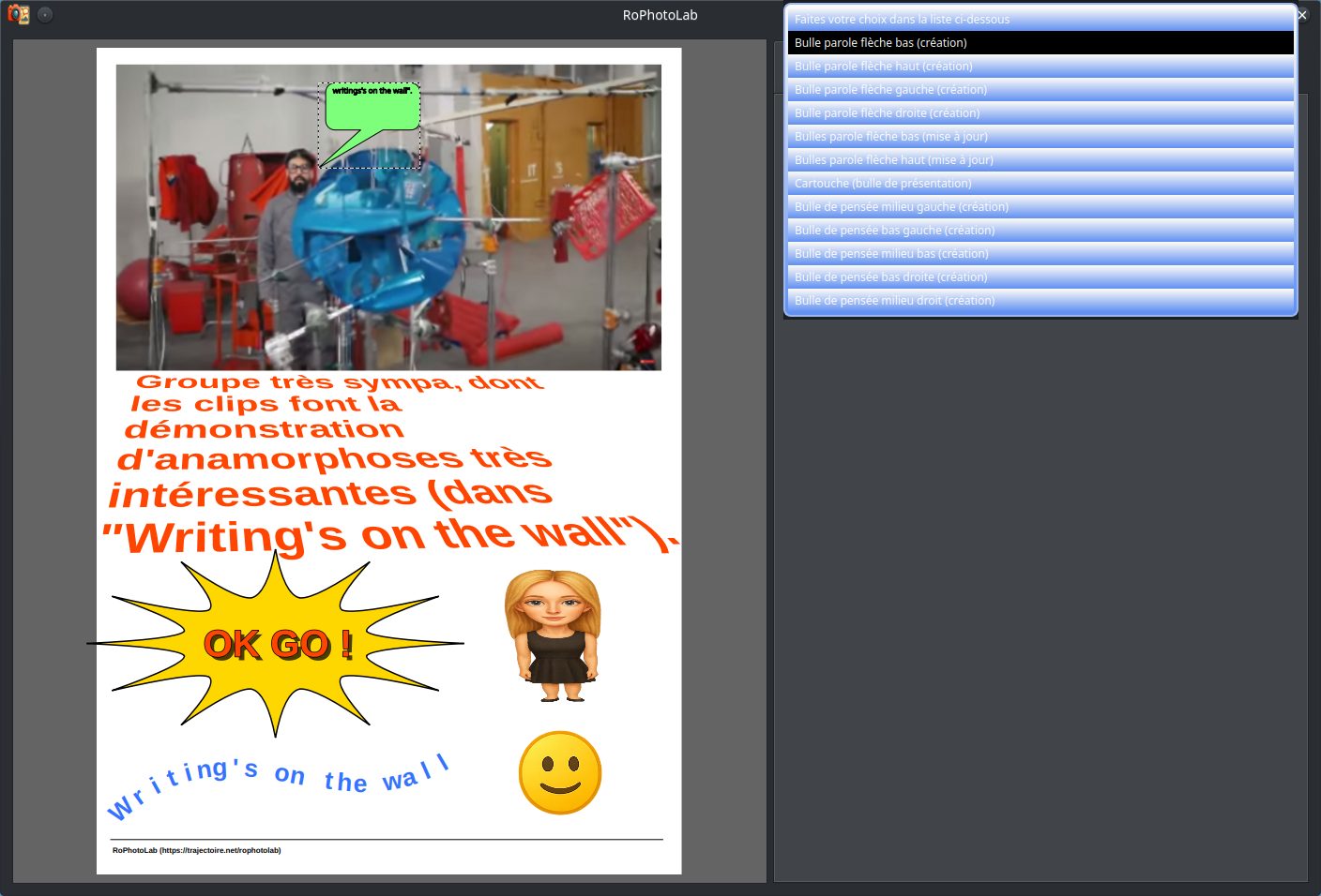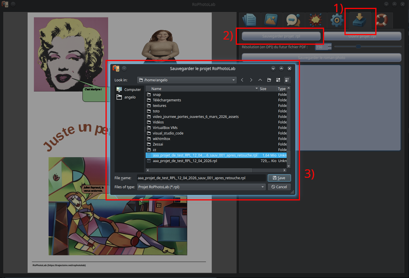 C'est une avancée considérable par rapport aux versions précédentes. RoPhotoLab est maintenant capable d'enregistrer et de redéployer l'intégralité d'un projet — images comprises — de même pour le contenu textuel des bulles et la position de leurs pointes, tout en permettant une édition fluide et intuitive après rechargement. Le cycle complet — créer, sauvegarder, rouvrir, retoucher, re-sauvegarder — fonctionne désormais sans perte d'information.
