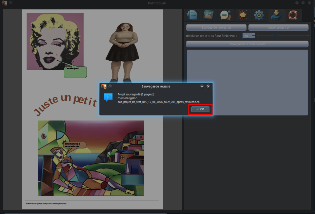 Désormais, un simple clic sur le bouton "Sauvegarder projet .rpl" enregistre l'intégralité du projet dans un fichier portant l'extension .rpl, le format natif de RoPhotoLab. Et voici un point essentiel à comprendre : ce fichier ne se contente pas de mémoriser la structure de votre projet — il embarque également toutes les images utilisées. Concrètement, cela signifie que vous n'avez pas besoin de conserver les photos originales à côté du fichier .rpl pour que votre projet s'ouvre correctement. Tout est contenu dans un seul et unique fichier, que vous pouvez déplacer, copier, envoyer par email ou stocker sur une clé USB sans jamais risquer de perdre un seul élément de votre composition. Le fichier conserve fidèlement toutes les pages, toutes les photographies ainsi intégrées, toutes les bulles et leurs textes, les onomatopées avec leurs couleurs, les titrages avec leurs effets de perspective, ainsi que les onomatopées texte contrôlables avec leurs courbes de Bézier et leurs points de contrôle. Rien n'est perdu, tout est mémorisé exactement dans l'état où vous avez laissé votre travail.