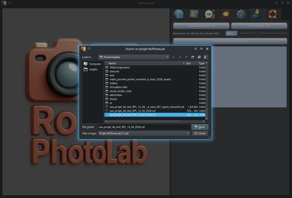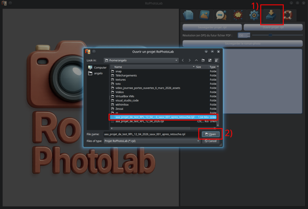 Nous allons maintenant ouvrir un autre projet et retravailler dessus — ce projet n'utilise qu'une seule page. Nous lançons RoPhotoLab, puis nous nous dirigeons vers l'onglet Sauvegardes et cliquons sur le bouton "Ouvrir projet .rpl". La boîte de dialogue habituelle permet de naviguer dans les dossiers et de sélectionner le fichier souhaité. Notez qu'il n'est pas nécessaire que les photos originales soient présentes sur l'ordinateur — elles sont déjà intégrées dans le fichier .rpl et seront restituées automatiquement.