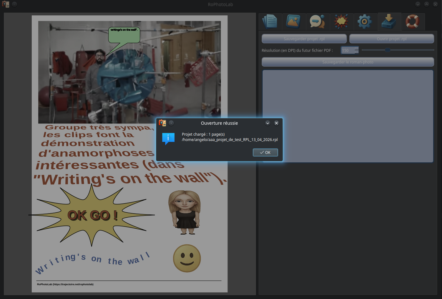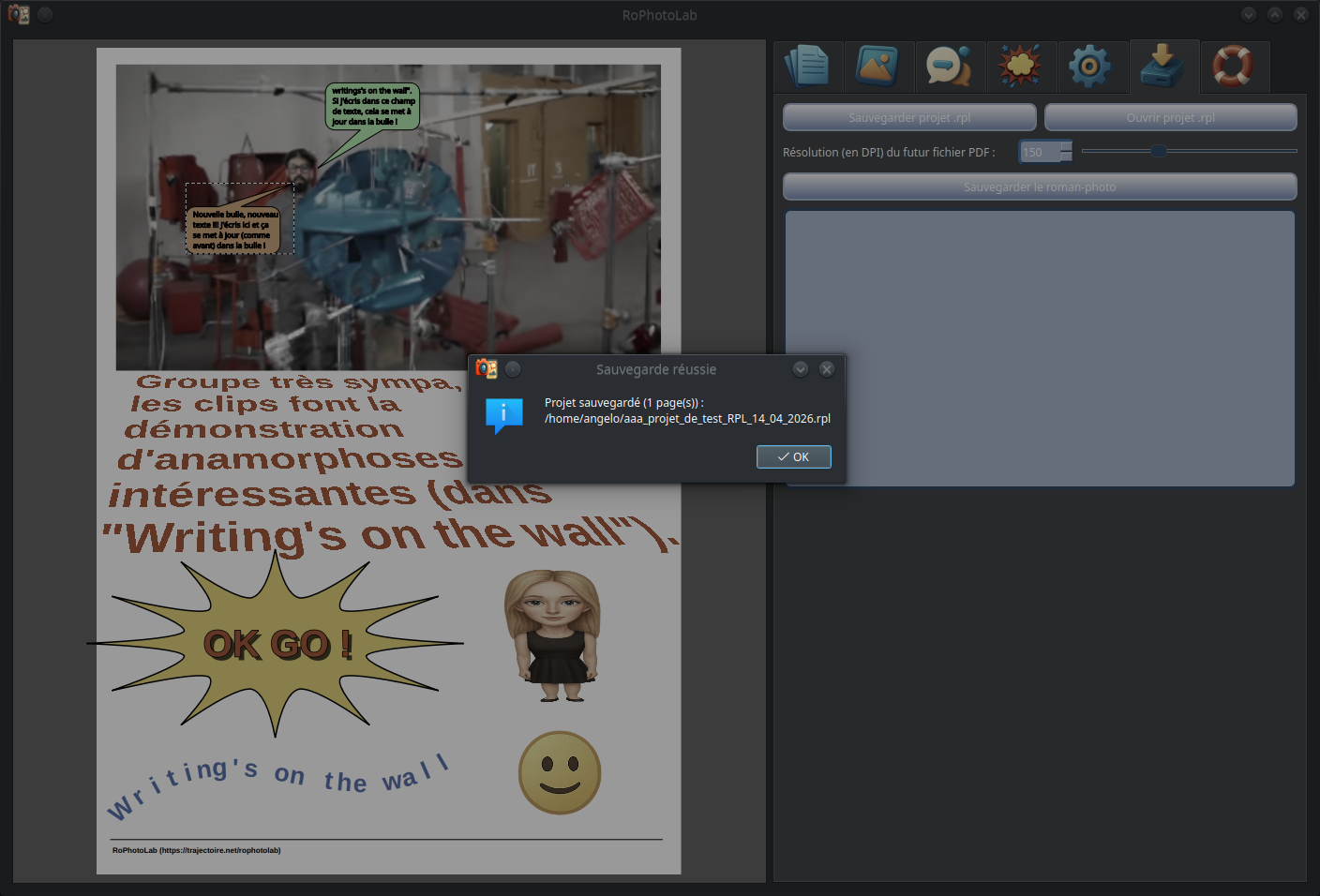 La confirmation de réussite apparaît. Le projet complet — photos embarquées, deux bulles avec leurs contenus textuels, leurs teintes et leurs positions de pointes, textes façon bandes annonces des vieux Star Wars, onomatopées contenues dans la page, émoticônes ... en fait tout ce qui apparaît à l'écran — est désormais enregistrée fidèlement dans le nouveau fichier .rpl.